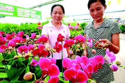 14日,在沂州路南段鲁南花卉市场内,两位女士在选购蝴蝶兰。随着中秋、国庆两节的临近,花卉市场迎来了又一次销售高峰。 记者廖杰摄