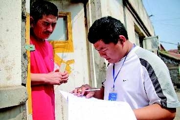 记者看到席菠手里拿着社区的实景拍摄图,上面逐一标注了楼牌号等详细情况,普查员说按照采取“区不漏房,房不漏户”的办法,从区片到楼到户,不能少登记一个住户。连续走访了三家,普查员都顺利地敲开了门。普查员仿佛吃了颗定心丸,说道:“14日我们就给全社区的楼长和片长开会发动,让每个楼长回去给自己所在的单元楼进行宣传。从第一天的情况看,效果不错,一般住户20分钟能结束,估计一个小组一天下来能调查30户。”