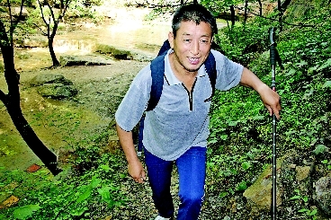 9月10日,晴天,龙洞山边的泉水淙淙流过,叮咚声反而让遍野绿树的山显得更加幽静。在这山泉峻峰边,—个背着背包、拿着登山棍的中年人孤独而执著地走着。