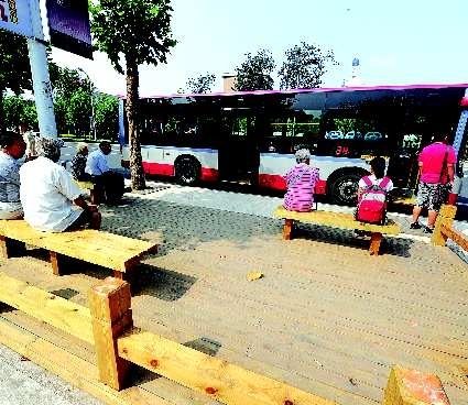9月16日,在济南英雄山北站牌前,市民们坐在木制的候车坐椅上等车。为了便利市民候车,近日该处特地修建了一处“原汁原味”的木制候车休息区,以樟子松为材料的坐椅跟此处的环境融为一体,非常和谐。