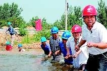作品描述:2010年7月23日,一场暴风雨过后,栖霞供电公司员工趟过150多米宽的湍急河流,为正在紧张施工的“南水北调”工程搬迁架线。