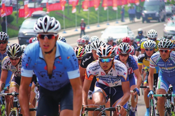 16日,参赛选手在望岳西路奋力前行。当日,2010年首届环中国国际公路自行车赛第五赛段的比赛在泰山脚下举行,来自国内外20支车队的120余名选手进行了激烈的角逐。 本报记者 陈琳 摄