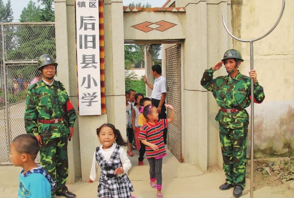两名退伍多年的老兵,为了守护家乡小学生的安全,每天身穿迷彩服义务在学校门口站岗执勤。执勤3个多月来,一名老兵还自创了一套钢叉操练术,并用钢叉成功制服了一名酒后闹事者。