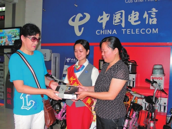 近期,泰安电信针对长途需求用户,特推出“号百秘书拨长途送大礼”优惠活动。据介绍,“号百秘书”用户使用“118388+被叫号码”拨打长途,资费只需0.16元/分钟,按照通话累计时长,季度前10名的用户均有机会获得手机等奖品,活动时间截至12月25日。图为电信老用户刘女士(左一)从泰安电信工作人员手中接过中奖的手机。 本报记者李芳芳摄