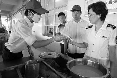 9月16日上午,聊城疾病预防控制中心开展学校食堂食品安全专项整治工作,对水城中学、聊城—中、聊城大学等22所学校进行食品安全专项监督检查o图为聊城疾病预防控制中心综合卫生所工作人员检查聊大东校食堂o 本报记者李军摄