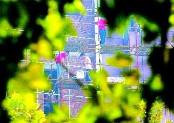 15日下午,在市区蒙山大道与解放路交会东侧—建筑工地内,几名建筑工人在没有任何防护措施的情况下,站在20多米高的建筑上作业,安全令人担忧o记者廖杰摄