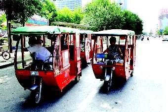 9月16日下午,在人民广场北侧公交停靠站,挤满了等待拉客的三轮车,致使公交