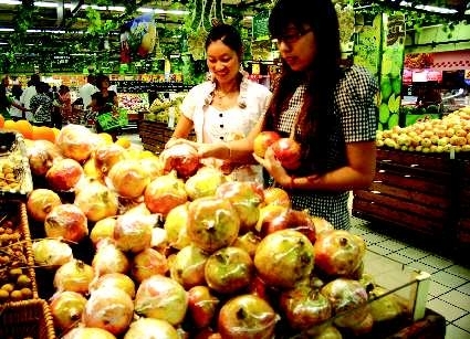 15日,在市区一家超市内,市民在选购石榴o随着秋天的气息越来越浓,石榴、大枣等本地秋令水果开始大量上市,吸引不少市民购买尝鲜。