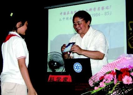 9月15日,中科院老科学家高登义教授把南极科考照片作为奖品送给积极回答问题的小学生o当日,省科学大讲堂青少年科普报告百校行临沂站活动在临沂第七实验小学开讲o报告会上,小听众们与老科学家互动交流,学习科普知识,感受科技魅力,激发了学科学、用科学的浓厚兴趣o