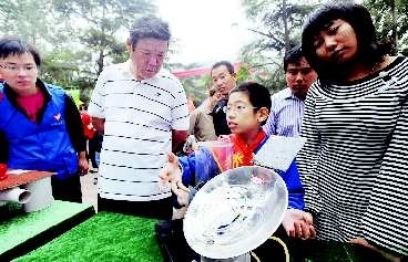 19日,胜利大街小学的学生焦晨泰(中)正在向观众介绍自己设计的反光式太阳能热水器。当天,山东省暨济南市2010年“全国科普日”活动启动仪式在英雄山北广场举行,现场既有来自科学院的科学家,也有—些小学生,他们共同展示科技的魅力,倡导低碳生活。本报记者 张中 摄