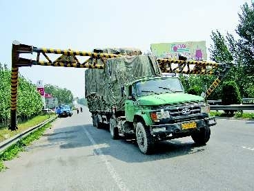 14日12时,河北省衡水市—个体司机驾驶—辆重型半挂车,从济南沿京福高速上行。由于装载超高,车行至德州市南外环高速公路“零公里”处时被限高支架卡住。由于车速过快,限高支架被连根拔起并拖行了8米多远车才停下来。“13日才刚刚装上的。”德州市公路管理局的工作人员说。 本报通讯员 王武昌 摄