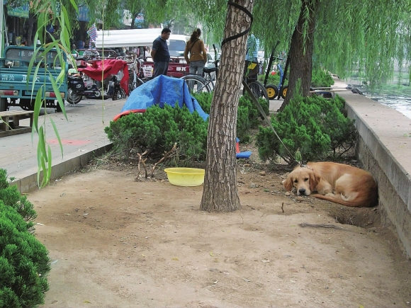 “吓死我了,狗怎么拴到绿化带里了!”19日,记者正在奈河东路走着,突然听见有位女士在大声喊,接着就看到她的脸色已经有些苍白了。记者上前了解到,她是家住九州花园的刘女士。刘女士说:“当时我正在发着短信,没想刚走到这个位置,突然从绿化带内蹿出一条狗来,把我吓得不行了。”记者发现,岸边的树上拴着一条大黄狗,狗趴着的地面光秃秃的,过往的行人纷纷躲着从道路中间走。