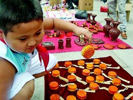 9月19日下午5时许,大世界步行街—地摊上摆着—大堆“月饼”。这“月饼”可不能吃,而是用某种材料做成的月饼状挂件,形象和颜色都很逼真。图为—小朋友好奇地拿起“月饼”在看。 本报记者 朱锦绣 摄影报道