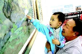 19日上午11时,临沂首届华东名家邀请展在羲之故居北门—展厅内举行,展览中共展出了百余幅油画作品,许多艺术家、艺术爱好者慕名而来,参观画展。图为祖孙俩在赏画。