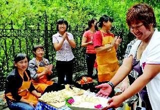 欢快的腰鼓,和谐的歌声,20日12时,阜桥街道后铺社区明珠小区观摩现场热闹非凡:100余人的老年腰鼓队精彩的表演吸引着人们的目光;尤令群众喜闻乐见的就是“百家饺子”大赛,参赛居民使用统的一桌子、锅、笊篱、围裙等物品,自备饺子馅和面团,现场包制,现场评出了“最漂亮饺子”,颁发饺子形状奖牌;趣味运动会、戏曲票友大联欢,蓝脸的窦尔敦盗御马,红脸的关公战长沙……在京戏《唱脸谱》的奏乐中,唱脸的、动作的,各类戏曲一个唱罢,又一个登场,一招一式,煞是高妙,更是绘出了一幅和谐社区、欢乐邻里图。