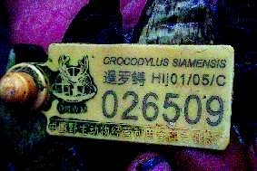 在小家伙的尾巴上,有一块黄底黑字的标识牌:“暹罗鳄HIJ01/05/C”、“中国野生动物经营利用管理专用标识”。
