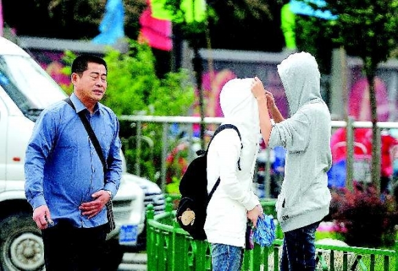 21日,济南泉城路上,一对情侣在寒风中戴上帽子避寒。当日较强冷空气影响济南,冷空气伴随着7级阵风,最低气温降至11℃左右,市民们直呼:“真冷!” 本报记者王媛摄
