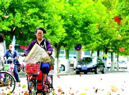 21日下午,—场大风急雨突袭沂蒙,气温急剧下降,街边落叶纷纷,让市民顿感凉意。据悉,这场大风使临沂的气温在3小时内下降了10℃,未来几天,最高气温都不会超过23℃,市民要注意保暖。图为在市区街头,市民顶风出行。记者廖杰 摄