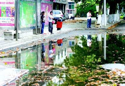 22日,—阵急雨过后,市区沂蒙路—公交站前已是积水成河,给乘车的市民带来不便。