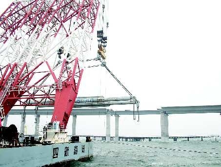 12日下午,记者在青岛海湾大桥施工现场看到,最后一片非通航孔桥采用的60米整孔预制箱梁已经安放在海面上,当海上潮位达到最高的时候就可以进行安装。据了解,这片预制的钢箱梁长60米,顶板宽17米、底板宽6.6米、高3.5米,重量约2050吨,在中国同类结构桥梁中排在前列,为长江以北地区最大的整孔预制箱梁,预制和架设过程技术要求高,施工难度大。其吊装高度超过杭州湾大桥,为目前国内特大型预制安装箱梁的最大高度。据了解,从2008年3月30日浇筑第一片箱梁开始,两年多的时间内共完成530片预制箱梁的预制与架设工作。
