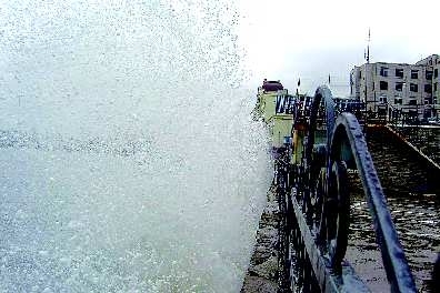 21日下午,威海港公园的海边,海面上大浪翻滚起伏,,形成约10米高的巨大水幕o22日,海上风浪仍较大,请市民不要太靠近海边o 本报记者陶相银摄