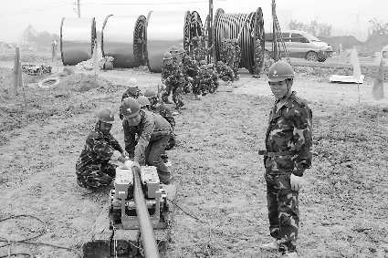 20日,位于城区北外环路旁的高压线缆下地工程开工,济宁供电公司职工在110千伏市中1、2号线线路架空改造施工,通过输送装置将电缆传送到地下电缆隧道内o据介绍,此次改造中,线路的7~80号杆塔的电缆需下地,进入新建的4.95公里的电缆隧道中,电缆敷设送电完成后,还要对沿途的杆塔架空部分进行拆除o 本报记者 刘守善 通讯员 邵博 摄