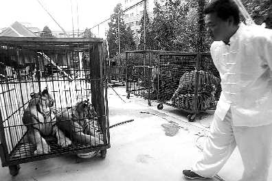 21日,在汇泉广场,工作人员正在为马戏表演做准备,老虎明星也已经做好了上场的准备o据介绍,青岛首届国际马戏文化节将于9月21日晚7时在汇泉广场拉开帷幕,表演的有老虎、狮子和马等动物o本报记者杨宁 摄影报道