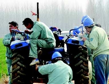 作品描述:野外施工人员在施工现场的拖拉机上吃午餐。