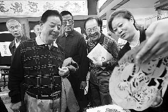 在参观过程中,民间艺术表演舞台上精彩的演出也吸引了不少老领导的目光,几名杂技演员正在轻巧地转动着手中的陀螺,时而翻滚,时而抛向空中,可陀螺却始终在优美地转动,老领导们目不转睛地盯着台上,并情不自禁地为他们鼓掌喝彩。