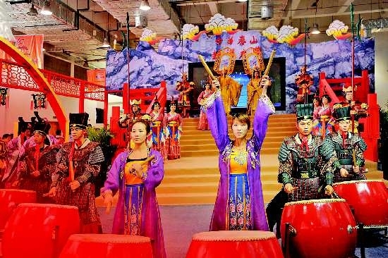 27日,“中华泰山封禅大典”从泰山搬进了文博会展厅。当日,第三届山东文化产业博览交易会在济南拉开帷幕。 本报记者 陈文进 摄