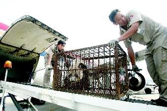 27日早上7点50分,名为秦川和乐乐的两只熊猫分乘两辆汽车前往西安咸阳机场,搭上了飞往青岛的飞机。不到12点半,飞机就降落在青岛流亭机场。