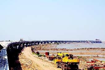 据青岛市公路局的工作人员介绍,白沙河特大桥横跨胶州湾、白沙河、洪江河、墨水河,桥梁全长1297米,是双高公路(双埠一高新区)工程第一合同段施工难度最大的控制性工程,建成之后青岛又添一座跨海大桥。