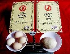 枣庄市市中区光明路街道村民李恒在庭院里散养—年多的—只母鸡,产下—枚长7.7厘米、宽5.3厘米、重320克的特大鸡蛋。近日,该鸡蛋被中国世界纪录协会认定为“世界最大的鸡蛋”。图为李恒用天平比较这个鸡蛋和普通鸡蛋的重量。 赵慧 吉喆徐瑞福 摄影报道