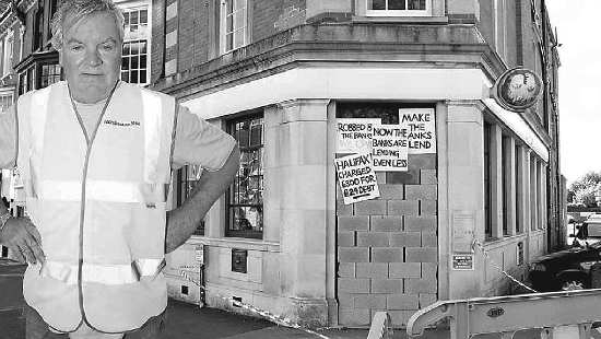 愤怒的霍普再也受不了了,今年9月26日,他竟然拖着一车焦渣石砖块来到了博内茅斯市一家巴克莱银行分部的门口,改行当起了“泥瓦匠”,用砖块砌墙牢牢封死了这家银行的大门!由于周日银行休息,所以霍普的砌墙行动没有受到任何银行员工的阻止。跟随霍普一起砌墙的还有另外几名从银行贷款被拒的当地商人,他们“携手合作”,最后终于在银行大门外砌出了一道2.4米高、1.2米宽的砖墙,将银行大门堵得死死的。