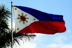 菲律宾国旗旗面左侧为白色等边三角形,内有一个金色太阳和3颗黄色五角星;右侧由一个蓝色直角梯形和一个红色直角梯形组成。蓝色象征和平、真理和正义;红色象征勇气。