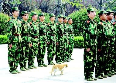 鲁平:你走猫步,我踢正步。mandd:你走你的猫步,我站我的军姿!张家善:任你严阵壁垒,我自闲庭信步!兰旋:猫步、正步能同步,有意思。