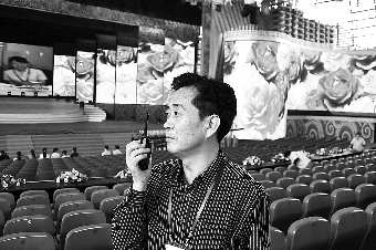 27日下午,曲阜杏坛剧场,周长征正在杏坛剧场调度指挥。记者看到,舞台两侧的彩幕上显示出乐舞《祭孔大典》的简介和资料照片。周长征介绍说,这是刚增加的内容,主要方便来宾了解济宁非物质文化遗产项目的有关情况。