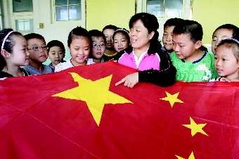 27日,德州市实验小学举行了“国旗、国旗我爱你”主题队会,教育学生从小热爱国旗、尊重国旗,培养学生的爱国之情。图为教师在给学生讲解国旗五颗星的含义。