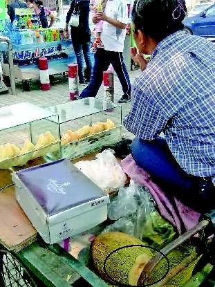连日来,记者在市区光明路、大世界、华联等场所,随处可见兜售西瓜串、哈密瓜串、菠萝块的流动水果摊,一元一串的价格使得这些切片水果非常畅销。27日中午,昆明路一家超市门前,一位水果商贩从三轮车里拿出了一个哈密瓜,并将哈密瓜尾部腐烂的部位切下,削皮后再均匀地切成片,随即用竹签穿好摆在了摊子上。由于腐烂的位置大小不一,切出来的水果串长度也不相同。当记者上前挑选时,这位商贩辩解说:“这是两个品种,小的甜大的脆。”