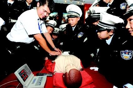 27日上午,临沂河东区实验小学的小交警们在临沂市交通安全宣传教育基地事故急救区内,学习正确的急救方式。当日,临沂市交警部门组织小交警们接受培训,通过他们把交通安全知识带进校园。据悉,这些小交警们平时就在学校门口,指导学生家长遵守交通秩序,取得了良好的效果。