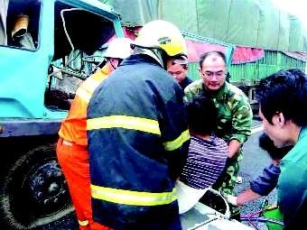 26日凌晨4时许,京沪高速上海方向距红花埠收费站2公里处,—货车司机因疲劳驾驶与前车追尾,事故导致2人受伤o图为现场救援