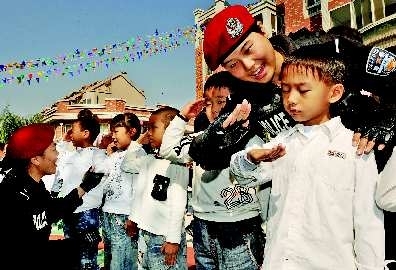 28日,济南市公安局特警支队联合山东省警察学院在卓雅·大风车幼儿园开展了“国旗下共成长,安全教育进校园”活动。特警队员们表演了精彩的队列、擒敌拳和对打等,并与幼儿园小朋友们亲情互动,手把手教授队列动作。本报记者郭建政 摄