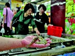 采访中,一位商贩对记者说,现在一些烟台、丹东、日照的养殖梭子蟹、对虾都被低价运到青岛抢占市场,很多新鲜海捕水产反而卖不动。“外面市场很多海物都是养殖的,运来以后按照海捕鲜货价格卖,有些养殖海鲜在海上装船,市民根本辨别不出来”,青岛市水产品市场工作人员对记者说。