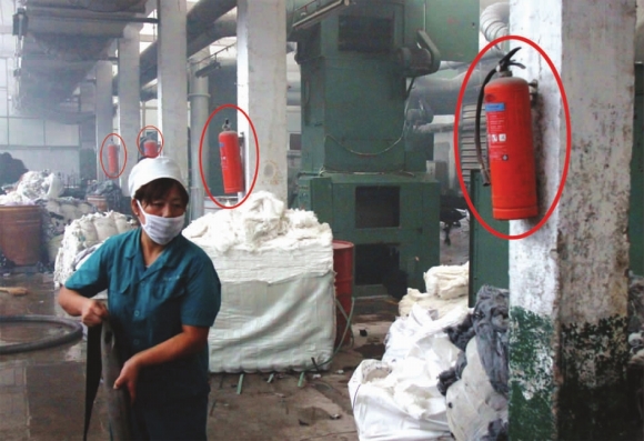 记者在棉纺厂车间看到,“消防重点单位”、“安全第一”等标语非常醒目,在起火车间南面,一排整齐的灭火器正安静的挂在墙上,表面都蒙了一层灰。一位知情人士向记者透露,起火原因是一位工人在车间维修电灯时产生火花所致。