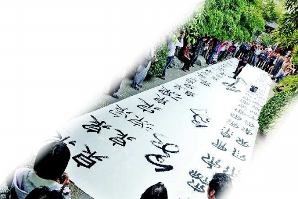 9月29日,在趵突泉畔,书法家梅傲雪在长20.1米、宽3.6米的巨幅宣纸上,用不同字体书写《七十二泉》书法作品,庆祝趵突泉水位突破30米大关,泉城群泉欢腾,喜迎国庆佳节。本报记者张中摄