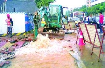 29日下午2点多,文化东路与山师东路路口,在路口做小生意的一位女士突然发现有大量的水珠从天而降,原来,一地下水管突然爆裂,喷出的水柱高约3米,“当时有辆挖掘机正在挖土,肯定是它挖断了水管”。