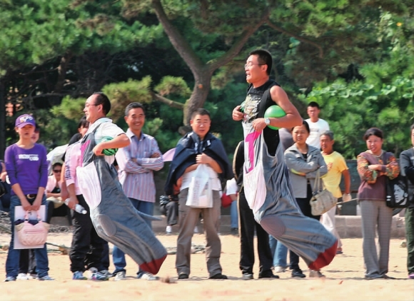29日,在第三海水浴场,一家公司的员工正在参加沙滩趣味运动。据介绍,为了给职工减压,趣味运动会设立了袋鼠跳、赶猪跑和接力球等趣味项目,在锻炼身体的同时,还能加强同事间的合作能力。