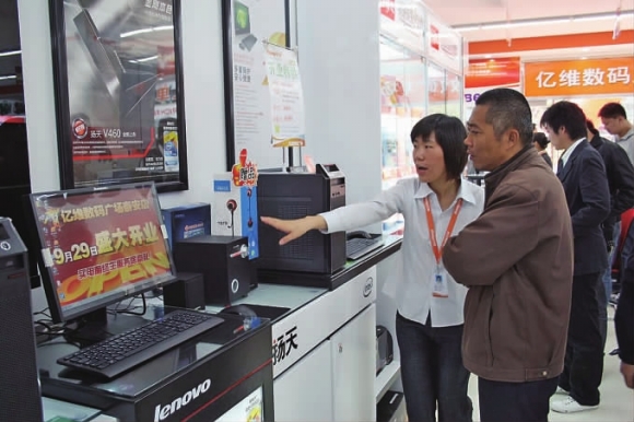 29日,山东省大型数码产品连锁销售企业———亿维数码广场泰安第一家店开业。亿维数码广场泰安店位于银座城市广场对过,主要经营各种品牌电脑、手机等数码产品,不仅可以进行家电以旧换新、电脑下乡活动,许多品牌电脑和数码产品还优惠1000元。图为销售人员正在向顾客介绍一款开业特价品牌电脑。 本报记者 孔红星 摄
