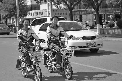 29日中午,文登市市中广场前,不少身穿校服的中学生骑电动车上学,在马路上形成别具—格的风景。本报记者侯书楠 林丹丹 摄
