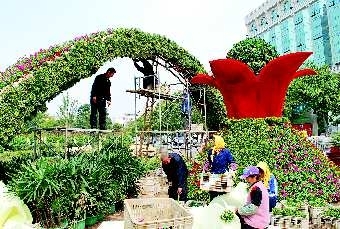29日,记者走访城区洸河路、共青团路、红星路及各处公园、广场时看到,城区主要道路两侧每隔一段距离便摆放了一堆花丛,在主要路口已扎好的各种花架上,园艺工人们正在精心组织花草,形成一个个充满创意、特色鲜明的植物雕塑o负责植物雕塑摆放的济宁市景臻园林有限公司负责人孙经理告诉记者,城区范围内共有各种植物雕塑16个,这些雕塑都是用一盆盆鲜花组成的,估计用量在90万盆左右o